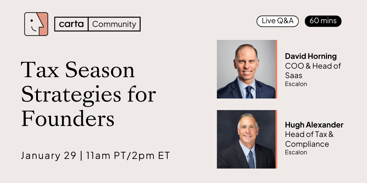 DISCLOSURE: This event is presented on behalf of eShares, Inc., dba Carta, Inc. (“Carta”). The content of this event is not, and no opinions or comments shared in this event should be treated or construed as, accounting, business, financial, investment, legal, tax, or other professional advice or services. This event is for information purposes only. The content of this event is not intended as a recommendation, offer or solicitation for the purchase or sale of any security. Carta does not assume any liability for reliance on the information provided herein and undertakes no obligation to update content. The opinions of the guests and host are their own and do not reflect the view of Carta or Carta’s affiliates. All product names, logos, and brands are property of their respective owners in the U.S. and other countries, and are used for identification purposes only. Use of these names, logos, and brands does not imply affiliation or endorsement.