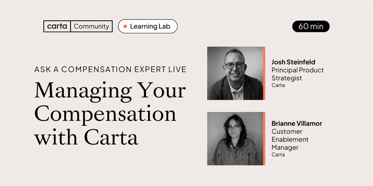 DISCLOSURE: This event is presented on behalf of eShares, Inc., dba Carta, Inc. (“Carta”). The content of this event is not, and no opinions or comments shared in this event should be treated or construed as, accounting, business, financial, investment, legal, tax, or other professional advice or services​​. This event is for information purposes only. The content of this event is not intended as a recommendation, offer or solicitation for the purchase or sale of any security. Carta does not assume any liability for reliance on the information provided herein and undertakes no obligation to update content. The opinions of the guests and host are their own and do not reflect the view of Carta or Carta’s affiliates. All product names, logos, and brands are property of their respective owners in the U.S. and other countries, and are used for identification purposes only. Use of these names, logos, and brands does not imply affiliation or endorsement.