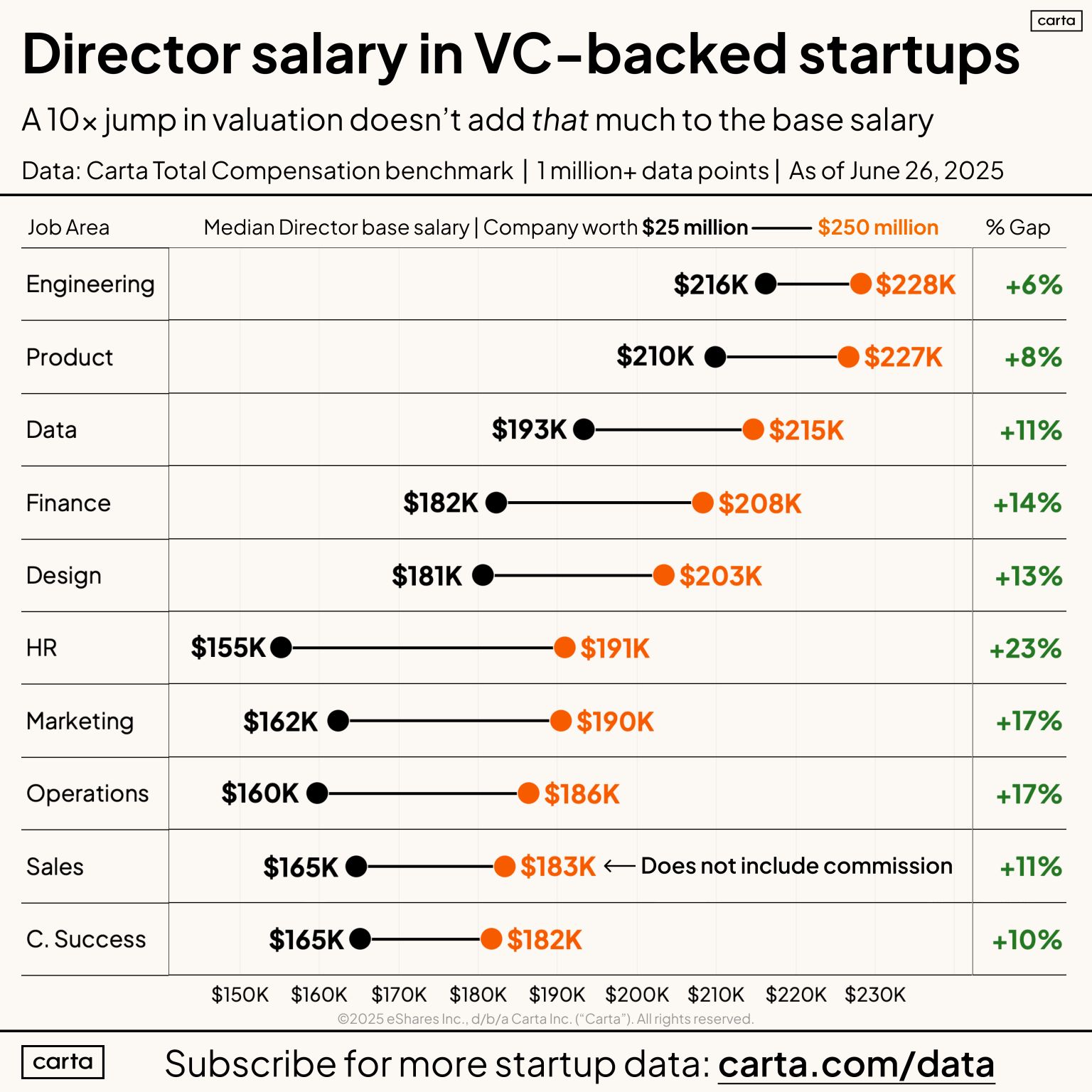 Look at a Director in Data, for instance. At a startup worth $25 million, the base salary for that position is currently around $193,000. At a much larger company worth $250M, the salary starts at $215,000.