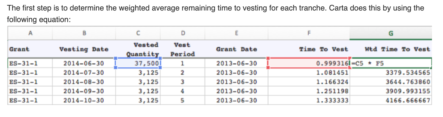 Hope you’re doing well. We’re trying to recalculate the weighted average time to vest per what is shown on Carta’s support site (https://support.carta.com/s/article/calculates-expected-term). Over here, it says the weighted average time to vest is equal to the quantity vested times the time to vest however we couldn’t find a formula for the time to vest. Could you please let me know how time to vest is calculated? Thank you!